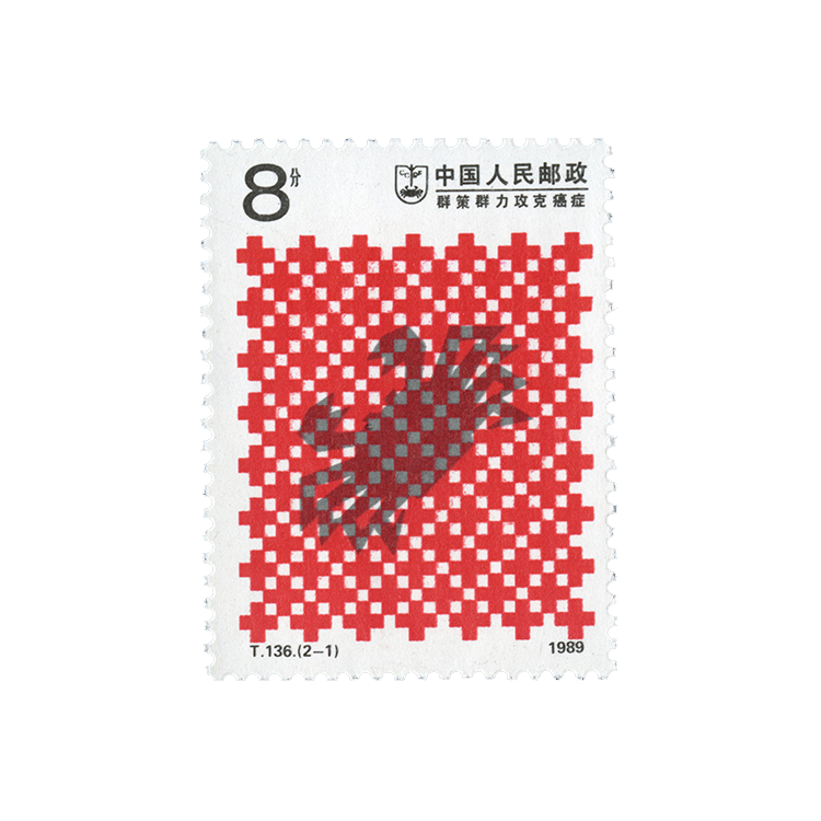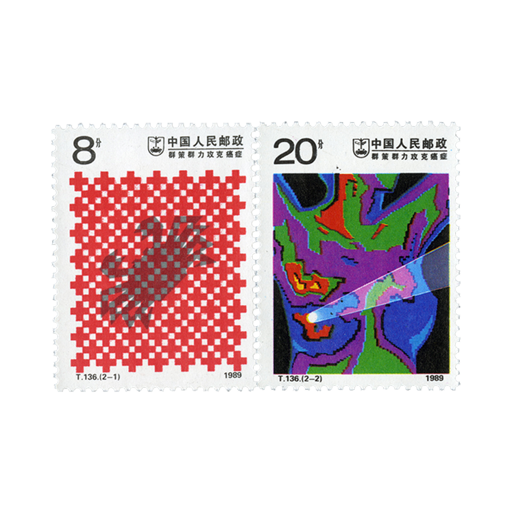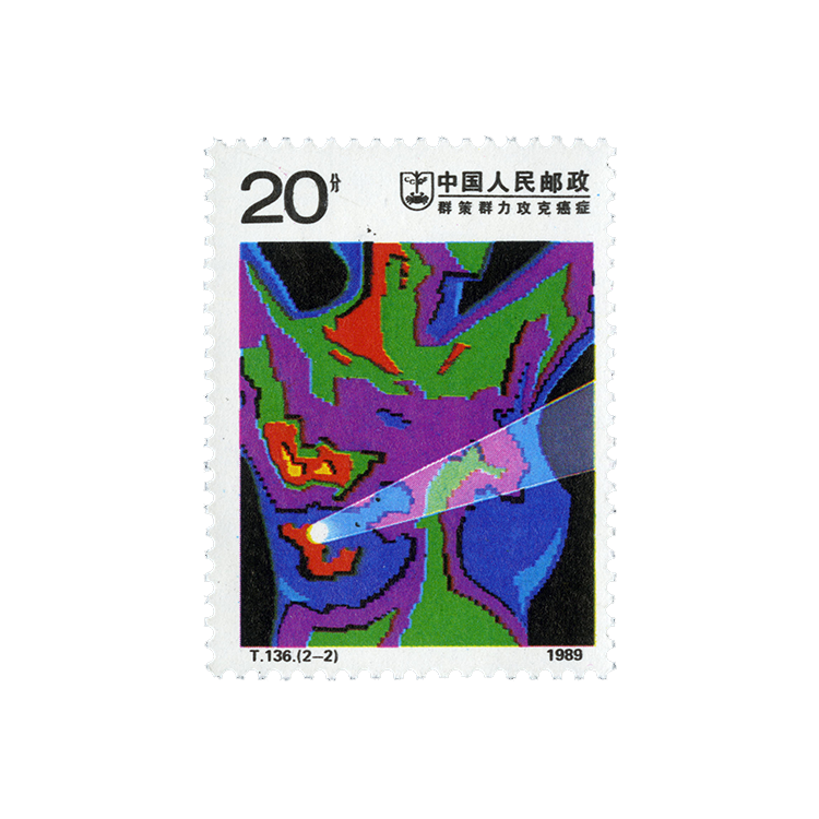 (2-2)主要是概括表现诊治癌症的手段。邮票选用的"热图象"画面是在检查人体时屏幕上所呈现的图像,右侧射进来的一束黄色射线,代表最有效的治癌方法--直线加速器放射疗法。设计者采用象征性的表现手法,图案清晰、简洁,色彩艳丽,具有浓郁的装饰韵味。