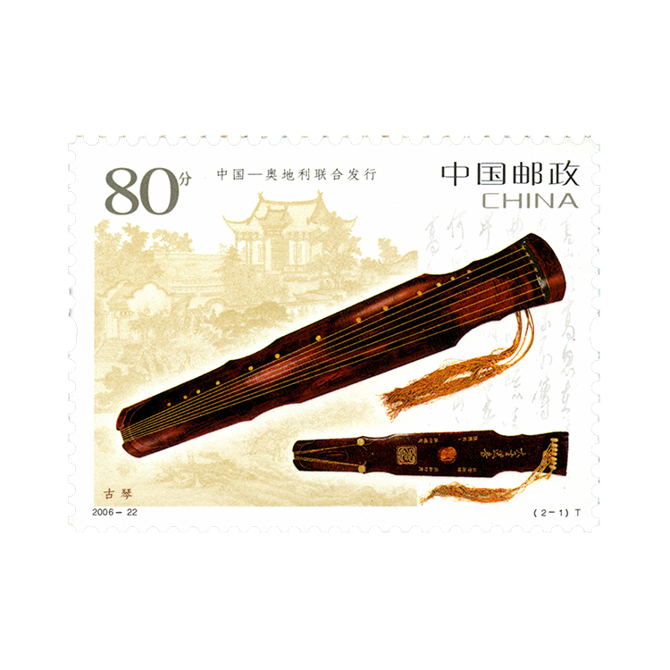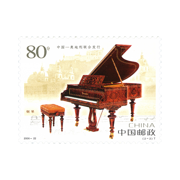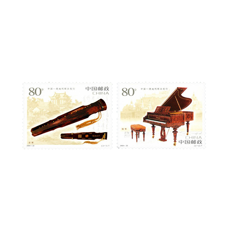 中奥两国为纪念建交35周年、莫扎特诞辰250周年中国邮政和奥地利邮政联合发行这两枚邮票。邮票在图案的选取上独具匠心,突出了文化元素,分别选取了代表两国文化的民族乐器:中国的古琴和奥地利的博泽朵夫三角钢琴。