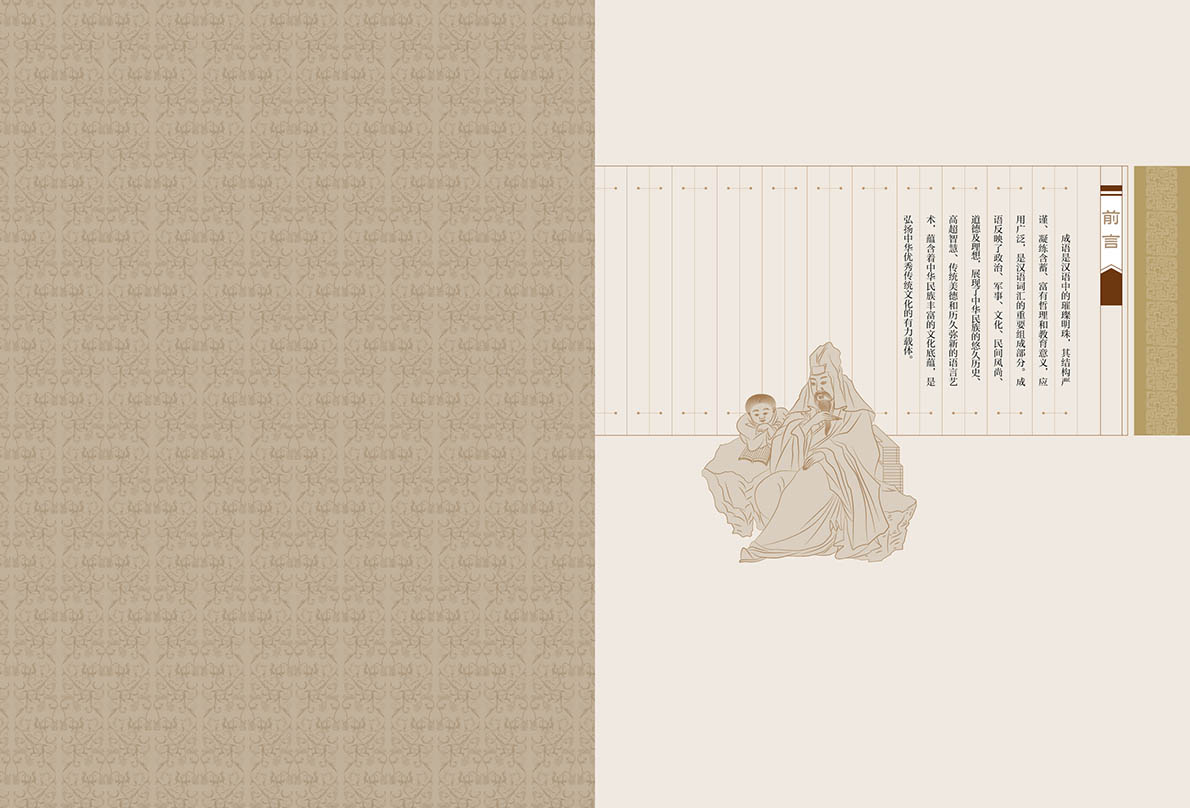 封面以春秋战国时期的人物、案几、青铜纹样和竹简等元素,表现大多成语起源于春秋战国时期,有着悠久的文化历史,是中国文化的重要组成部分,那些有趣而富有哲理的成语故事书写在竹简上,得到世代相传。