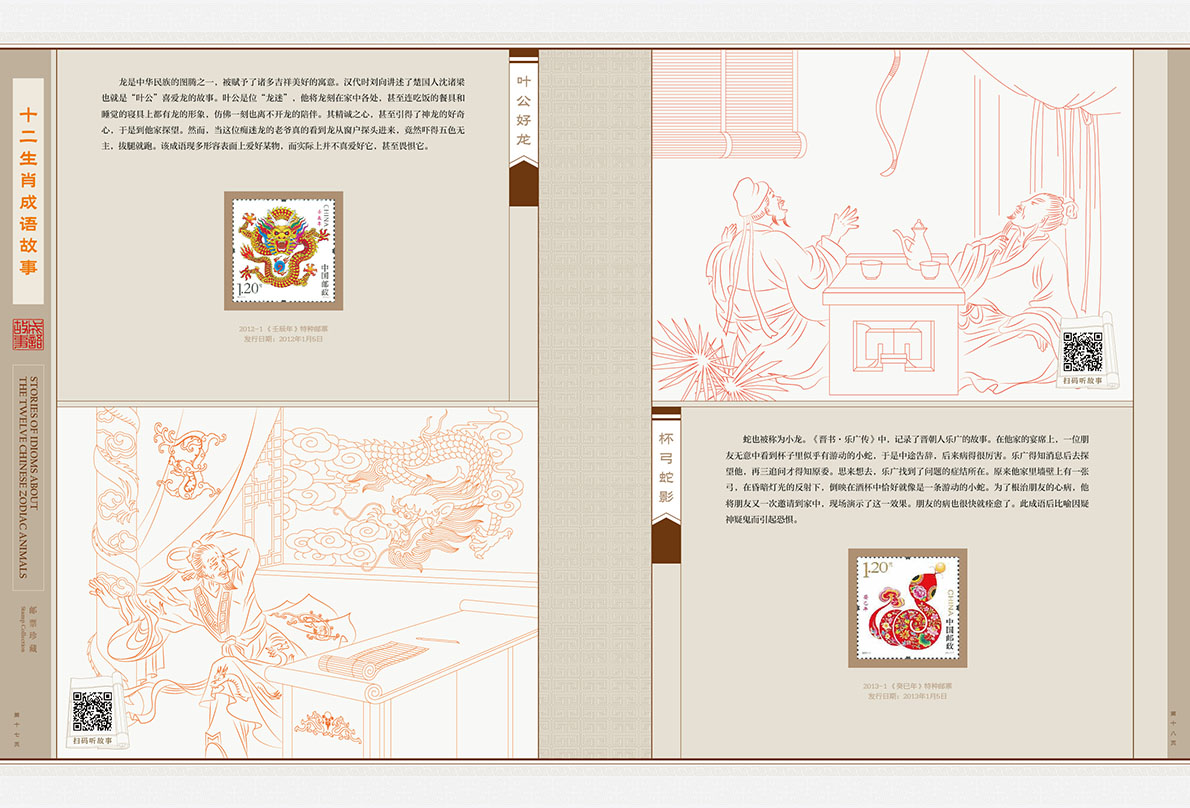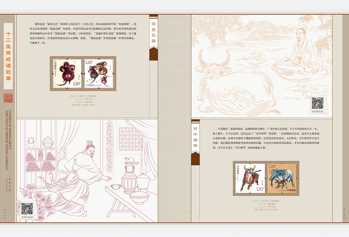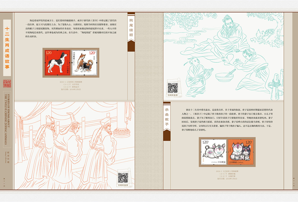 内页结合生肖邮票,图文并茂展示12个与生肖有关的成语故事。彰显成语在华夏历史文化长廊中独树一帜,堪称国之瑰宝。