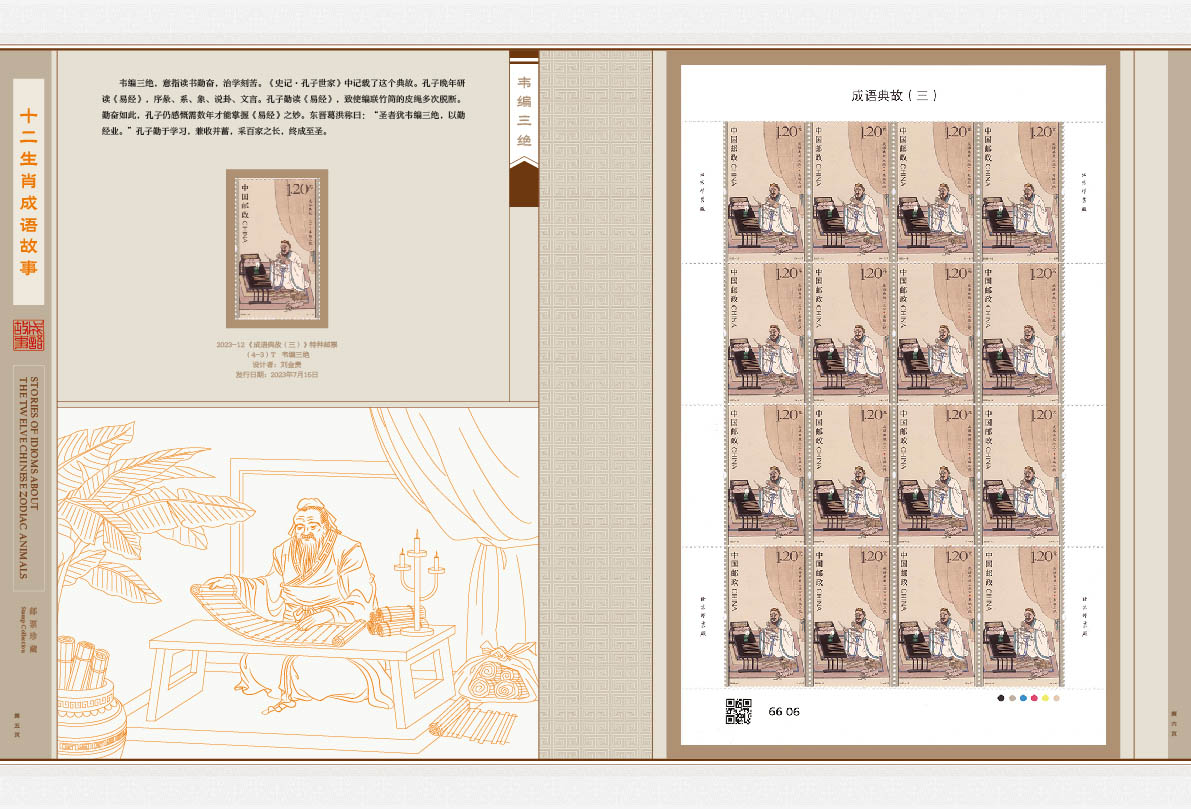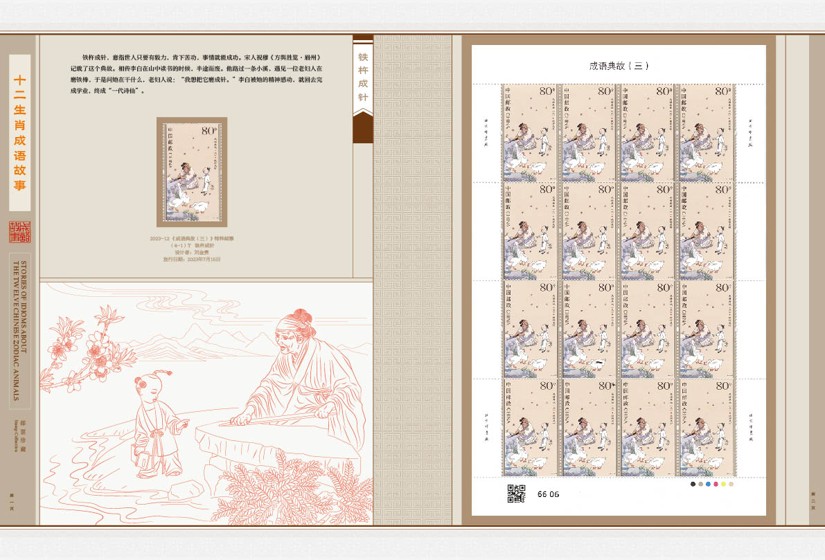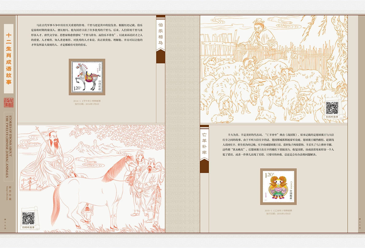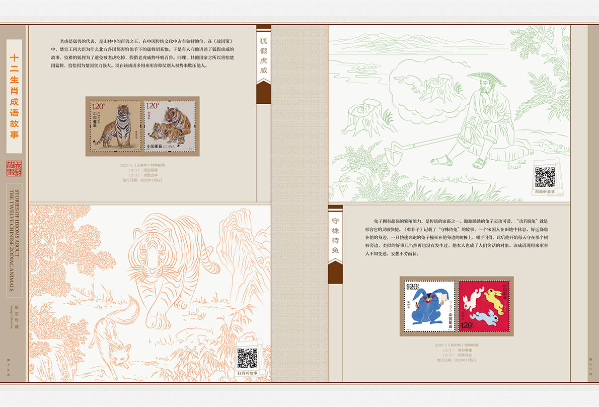 内页结合生肖邮票,图文并茂展示12个与生肖有关的成语故事。彰显成语在华夏历史文化长廊中独树一帜,堪称国之瑰宝。