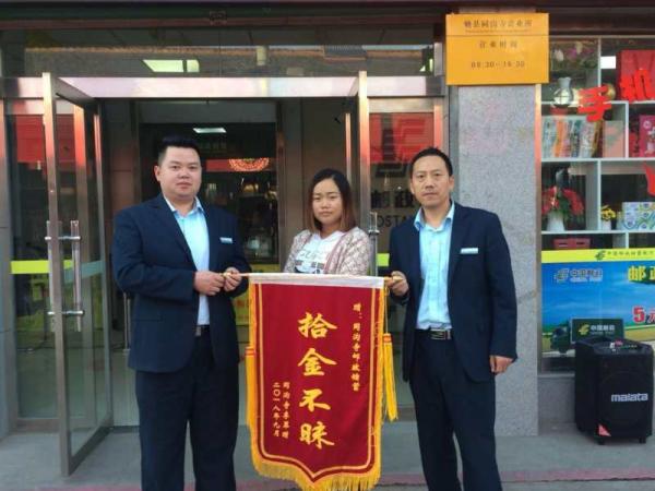 事情还要从9月15号说起,同沟寺支局开完晨会后,支局长陆晓华在营业厅做班前准备工作时,在填单台下发现一个黄金手链。陆晓华立刻与全所人员商议如何寻找失主,大堂经理张皓然回忆说:昨天下午4点左右我打扫营业厅卫生时,填单台下并未有手链,估计应该是临下班时来办理业务的用户遗失的。通过调阅监控录像并查阅了前一天的交易明细后,确定是前一天下午临下班前来办理业务的同沟寺镇同沟寺村李翠丢失的。随即支局长陆晓华和大堂经理张皓然两人亲自将黄金手链送到用户李翠手中,李翠激动说:手链是上个月过生日时,老公送给自己的礼物,价值5000多元,丢了以后自己也很沮丧,没有想到邮局又给自己送了回来,自己及其家人对同沟寺支局的工作人员非常感激,于是便有了开头送锦旗的一幕。