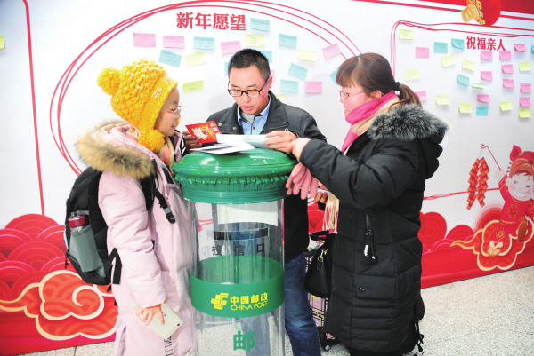 2 月 1 日,由新疆维吾尔自治区邮政分公司和中国铁路乌鲁木齐局集团有限公司、乌鲁木齐铁道国际旅行社联合开展的“平安春运,有序春运,温馨春运,让旅客体验更美好”明信片免费邮寄活动启动,2000 枚承载旅客思念的明信片飞向全国各地。图为在乌鲁木齐站候车大厅等待出发的李先生一家人被现场气氛热烈的明信片邮寄活动吸引,围着邮筒在明信片上书写着对远方亲人的思念。