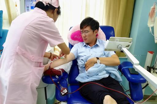 活动当日的大雨也没能阻挡党员们参与献血的热情。有着多年献血经历的党员陈旭首次捐献血小板,经过一个多小时他最终成功捐献血小板1单位;“熊猫血”RH阴型血型的党员周浩直接献血400毫升,补足了血站稀有血型备血库的需求……活动中,该分行的党员们都为自己能向社会奉献点滴爱心和力量而感到满足与自豪。据统计,此次活动共22名党员报名参与,最终成功献血16人。图为陈旭在捐献血小板。