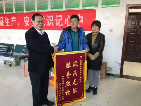 近日,霸州市第二医院办公室薛明丽主任代表全院职工,为廊坊分公司直属胜芳支局投递员孟祥标送来了“风雨无阻 服务热情”锦旗。期间,不断赞扬投递员孟祥标同事的爱岗敬业精神,六年来,无论风霜雨雪每天都热情礼貌地坚持给二院送信送包裹,得到霸州市第二医院全体职工的认可,“平凡的小事每天坚持做下去就是伟大”。