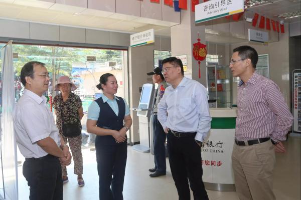 谷德凯在三亚崖城支局向省劳动模范卢黎霞了解网点发展情况