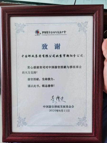 在本次活动中,朝阳区分公司总经理袁喜与中国器官移植发展基金会理事长黄洁夫、著名艺术家韩美林共同为“器官捐献 生命接力”邮册揭幕。为感谢朝阳邮政的大力支持,该基金会秘书长赵洪涛还为朝阳区分公司总经理袁喜颁发致谢证书。