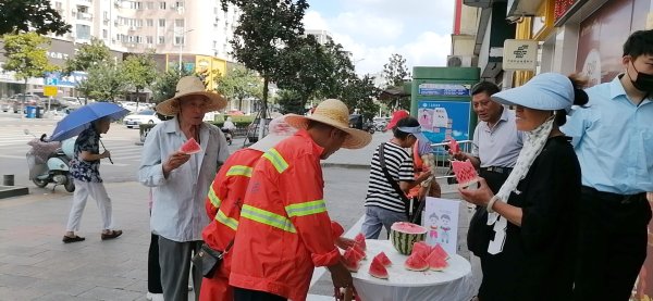 “这西瓜又大又甜,邮政服务真贴心。”7月21日上午,在花山商业街营业所门口,一群环卫工人吃着邮政网点免费提供的西瓜,非常高兴。