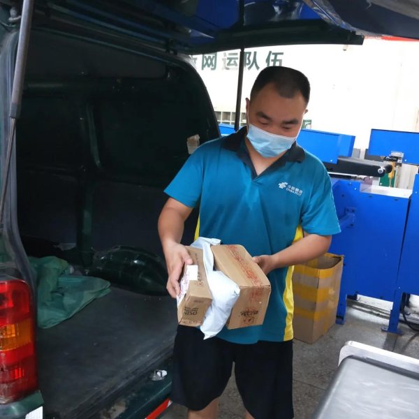 一大早,气温便陡然升高。投递员谢智抓紧时间装车,赶紧出发。