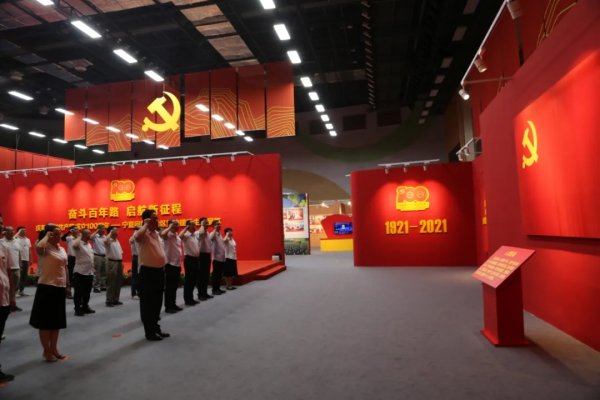 在展厅,全体参观人员面向党旗重温了入党誓词,表达了宁夏邮政人对党的忠诚和为共产主义奋斗终身的坚定信仰。