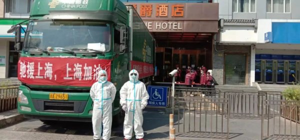 “车来了!”早早等在上海璞爵酒店门前的防疫志愿者们兴奋起来。身穿防护服的驾驶员周厚强和吴洪兵同时打开车门,跳下邮车,熟练地和四川援沪医疗队工作人员核对信息。随后,麻利地打开车厢,开始交接防疫物资。