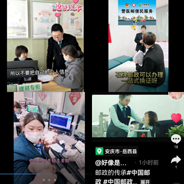 本次活动自3月初开始,历时一个多月,共征集短视频作品109个,最终根据视频内容、播放量、点赞数综合评选出了30个优秀作品。大家通过舞蹈、模仿秀、场景故事等多种创新体现方式,有的讲述了两代邮政人的故事,有的分享了自己在邮政成长的历程,有的通过镜头展现了日常工作场景,各式各样的短视频传达了安庆邮政人不一样的喜怒哀乐,展现了安庆邮政多元、创新、活力、奋进的良好形象。