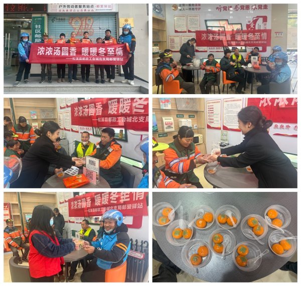 驿站里一派欢声笑语的节日景象。邮政工作人员热情地为环卫工人、快递员、外卖员等户外劳动者们盛上热气腾腾的汤圆,不忘提醒他们在寒冷的天气中注意保暖和交通安全。一份甜蜜的汤圆、一个温暖的笑容、一句温馨的问候,无不传递着邮政浓浓的深情厚意。户外劳动者们高兴地说道:邮爱驿站工作人员真细心,一颗颗柿子形状的汤圆,寓意着事事平安、健康幸福的美好愿望,在寒冷的冬日里,这一碗汤圆不仅暖胃,更暖心。