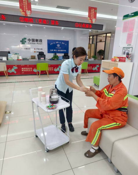 活动中,邮政工作人员亲手将一瓶瓶冰镇饮料递到环卫工人手中,并真诚地道一声“辛苦了”。一位刚结束早班清扫的阿姨感动地说:“能有个地方坐一坐、喝口水,心里特别暖。”这不仅仅是一杯水的关怀,更是一份对平凡岗位伟大奉献的尊重与认可。