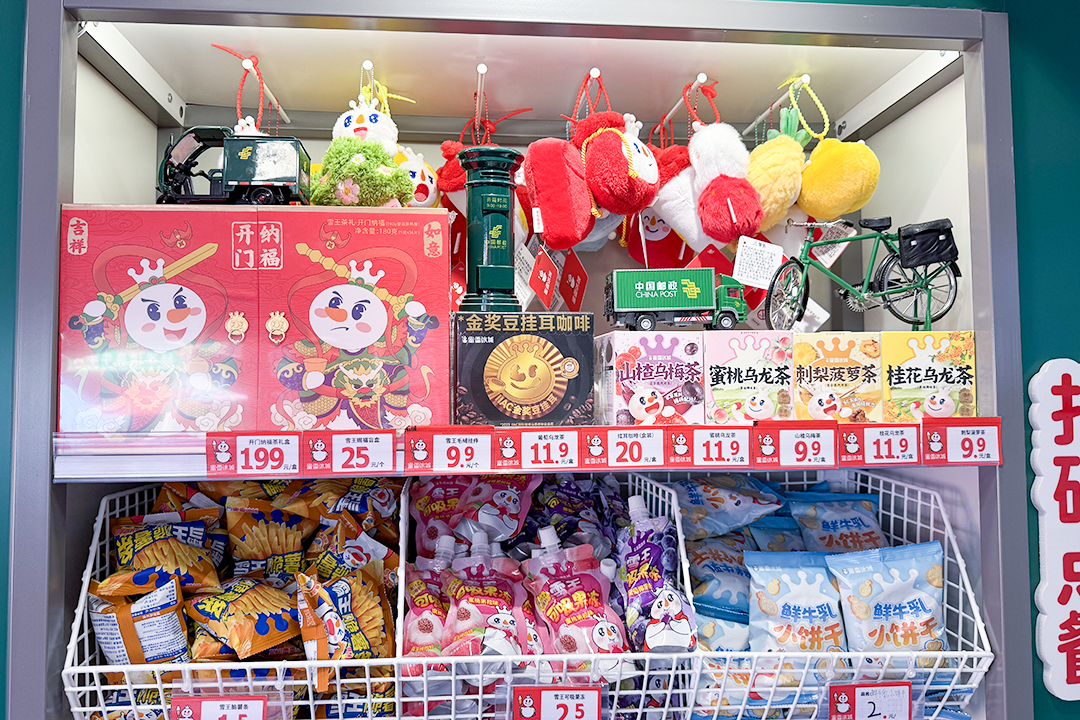 钢二路联名店整体以绿色为主基调,经典的“蜜雪红”换为了“邮政绿”,门头巧妙融入了邮戳元素,装饰画上可爱“雪王”穿上了邮递员背心,俏皮又吸睛。在饮品点餐区旁,邮筒、邮政汽车等文创产品有序摆放,浓浓的“邮”味弥漫在店内的每一个角落,让人一进店就仿佛踏入了一个充满创意与情怀的奇妙空间。