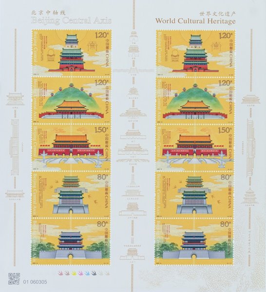 本套邮票由南往北分别表现了永定门、正阳门、天安门、故宫、景山、钟鼓楼等多处中轴线上主要历史遗存。