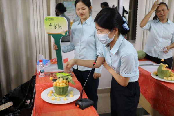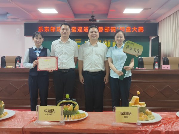 哈密瓜切盘创作环节堪称活动的“高光时刻”。30分钟的创作时间里,操作区里刀光流转,各队创意频出。顶瓜瓜队精心雕琢出“一路生花,扬帆起航”的作品,巧妙地将邮政元素与哈密瓜的香甜交融;邮递传香队打造的“传香万里”作品,借瓜块勾勒邮路,蕴意让乐东甜香传向世界;一刀定甜队则以整齐的摆盘和清晰的邮政标识吸引了众人的目光,展现出简洁而大气的风格。主持人实时暖场,一句“看这雕刻手法多细致”,瞬间将大家的注意力聚焦到作品细节,线下观众踮脚围观拍照,线上点赞量更是突破2万。