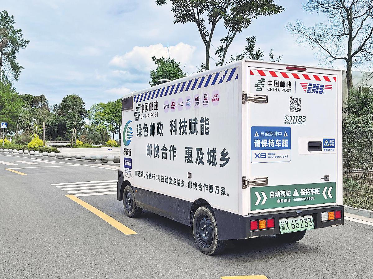 在重庆市巴南区二圣镇的乡村路上,老远就听见一阵俏皮的声音飘来:“自动驾驶中,随时停车,请保持两米车距哦!”发出声音的正是重庆邮政的“邮运通”无人车。“双11”物流高峰前夕,重庆市首条乡镇无人快递投递试点线路正式启用。