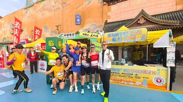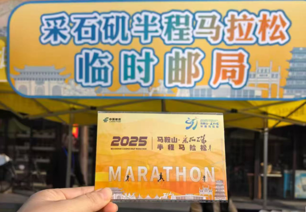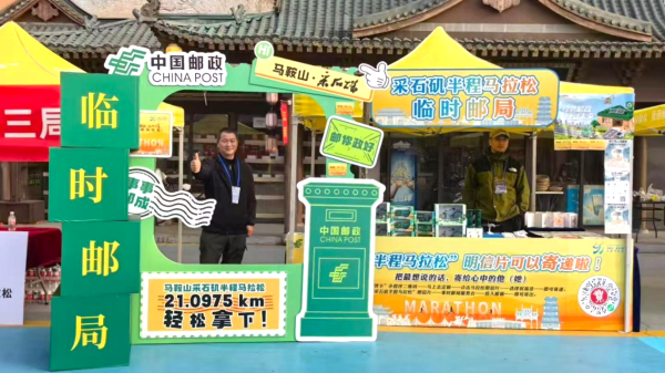 在采石矶景区广场,马鞍山市邮政公司精心打造的“‘邮’你跑向诗和远方”主题邮局成为赛事现场的焦点。绿色的邮筒矗立在古色古香的展架旁,展台上整齐摆放着融合采石矶元素的文创产品,每一件都承载着马鞍山的历史文脉与诗意情怀。