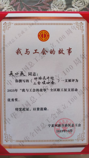 近日,宁夏回族自治区总工会“我与工会的故事”全区职工征文活动评选结果揭晓,银川邮政工会选送的职工吴小英凭借真挚动人的作品荣获优秀奖。