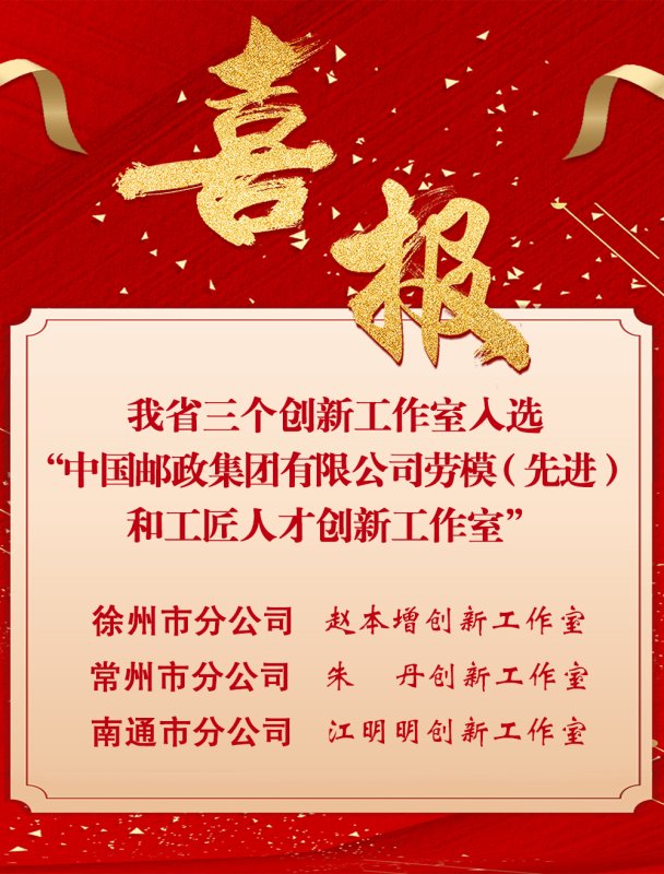 近日,中国邮政集团有限公司、中国邮政集团工会联合印发《关于命名“中国邮政集团有限公司劳模(先进)和工匠人才创新工作室”的通知》(中邮联〔2025〕574号),正式命名表彰50个“中国邮政集团有限公司劳模(先进)和工匠人才创新工作室”。我省“赵本增创新工作室”“朱丹创新工作室”“江明明创新工作室”凭借在业务攻关、创新增效、人才培养、技能传承等方面的扎实实践和突出成效荣耀上榜。