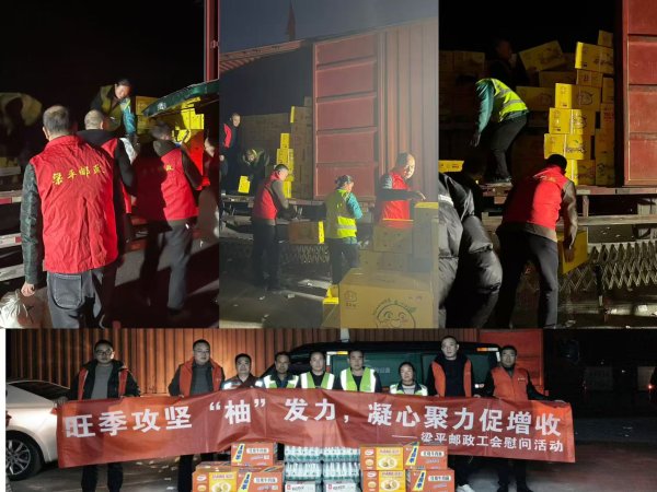 为凝聚攻坚合力、提振员工士气,12月初,梁平邮政总经理带队深入合兴镇龙滩村柚子寄递一线,开展“旺季攻坚‘柚’发力,凝心聚力促增收”工会慰问活动。
