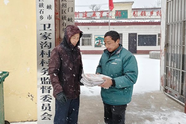 面对强降雪和寒潮侵袭豫西山区,三门峡市陕州区邮政分公司投递员头顶寒风,脚踩积雪,坚守工作岗位不停歇,皑皑白雪和邮政绿交相辉映。