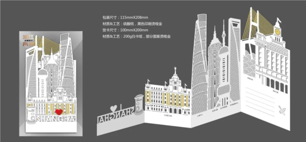 紧扣“浦江两岸”地理文化符号,强调“外滩历史建筑+陆家嘴现代地标”的对比感,赋予产品故事性。用“激光雕刻复刻轮廓”“层叠立体结构”解释纸雕工艺;展开贺卡瞬间,黄浦江两岸地标跃然纸上,层叠的立体结构在光影交错中诉说城市传奇。