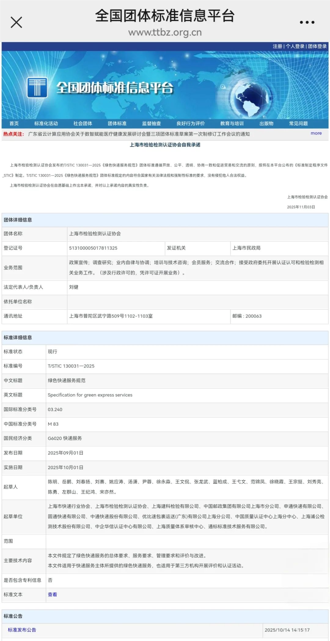 近日,由上海市快递行业协会、上海市检验检测认证协会联合牵头,中国邮政集团有限公司上海市分公司参与起草的团体标准T/STIC 130031-2025《绿色快递服务规范》在全国团体标准信息平台公告发布,并于 2025年10月1日起正式实施。市分公司副总经理徐永淼作为起草人之一,代表企业将“邮政经验”纳入标准,彰显央企绿色引领担当。