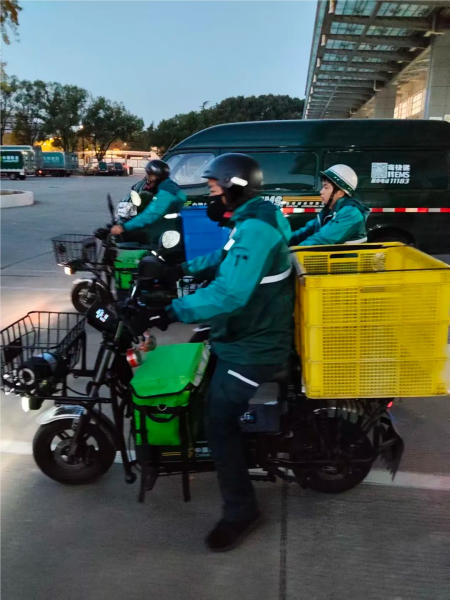 清晨的徐汇天光未亮,路灯还映着薄雾,一群身穿绿色制服的邮政投递员已悄然出发,他们穿行在朦胧的晓色中,把一瓶瓶鲜奶稳稳送上老人的餐桌。