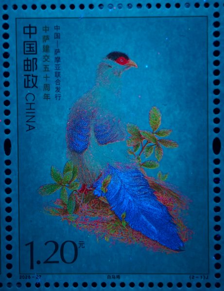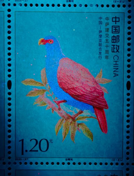 邮票采用高精度六色胶印工艺,使用原黑、天蓝、深红、中黄、专金、无色蓝荧光油墨,画面细腻,层次丰富,主题突出。在紫外线灯照射下,红墨发红光,蓝墨发绿荧光,无色蓝荧光墨发蓝光,增加了邮票的防伪性和美观性。 本套邮票一套两枚,分别以中国的“白马鸡”和萨摩亚的“齿嘴鸠”作为主体。胶印工艺的高清晰度和鲜艳色彩,清晰体现出邮票的丰富层次,白马鸡和齿嘴鸠生动活泼,色彩鲜艳,栩栩如生,羽毛线条清晰分明。在紫外线灯下,白马鸡的尾巴和齿嘴鸠的腹部发出鲜艳的蓝色荧光,鸟翅膀发红色荧光,树叶发绿色荧光,提升邮票赏玩性能的同时,提升了邮票的防伪性能。整体工艺充分体现了中萨建交五十周年的文化交融主题,通过高精度印刷将两国特有鸟类的羽毛纹理和鲜艳色彩完美呈现,彰显印制技术的创新性与邮票的珍藏价值。