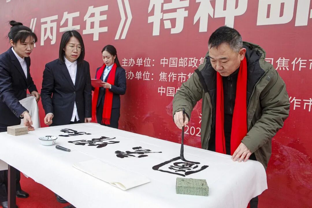 焦作市邮政分公司在高新区龙源湖集邮营业厅举办了“驰跃宏图 万骏臻福——《丙午年》特种邮票发行”活动。活动上,市文联副主席、市书协主席毋立现场挥毫题写“驰跃宏图 万骏臻福”,祝贺马年生肖邮票发行。活动还向属“马”的市民代表赠送了精美的马年明信片,并启用了极具纪念意义的“演马(临)”日戳。