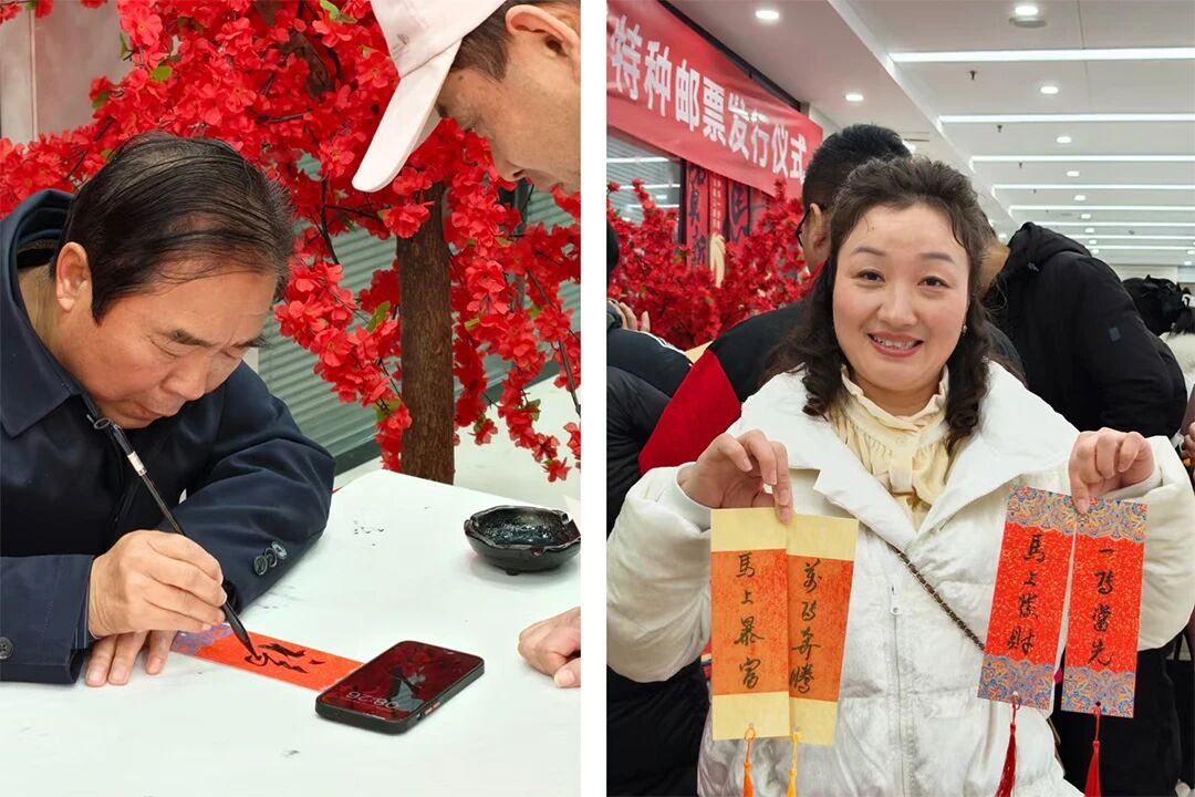 周口市邮政分公司在黄河路支局举办《丙午年》特种邮票发行活动。活动设有明信片、冰箱贴打印,文创及邮品预定等专区,还有书法老师写年味十足的春联送祝福,更有趣味盎然的邮品知识问答环节,让市民在多样的体验中感受了传统文化魅力。