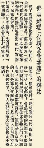 那个年代,为了方便人们从外地购买物品,邮局开通了“代购货物业务”,也就是接受群众委托,从指定地点邮局代买物品,然后作邮包寄回。因为邮政机构遍布全国,所以人们想买西北的毛线、上海的文具、各地土特产品等,大都可以买到。邮局备有“代购货品目录”,即便超出目录范围,只要有物品名称和产地,购买需求也差不多能够满足。(1952年12月28日《北京日报》2版,《邮局办理“代购货物业务”的办法》)
