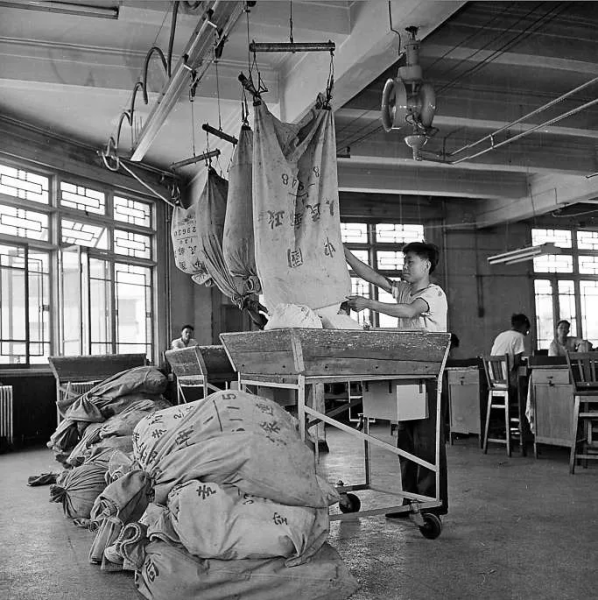 1963年,邮局工作人员在分拣包裹。李晞摄