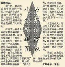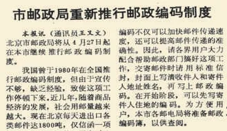 包括本报在内的多家报社在报纸上带头刊登自己的邮政编码,同时按照国家标准印制各自的专用信封。在各大报纸的推动下,填写邮政编码的人越来越多。(1987年9月24日《北京日报》2版,《首都各家大报率先刊登邮政编码》)