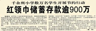 那时候,一场由小学生参与的邮政储蓄活动引发了不小的轰动。1995年底,北京团市委、少先队北京市工作委员会和北京市邮政管理局共同发起了“红领巾节约行动”,号召孩子们把零花钱、压岁钱存到家庭、学校附近的邮政储蓄点,办理活期储蓄,支援国家建设。(1996年2月20日《北京日报》2版,《孩子的压岁钱可派上用场》)全市多所小学的学生热烈响应。