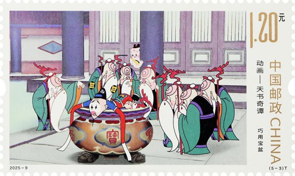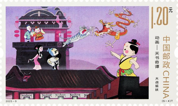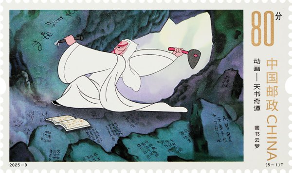 中国邮政定于2025年6月1日发行《动画——天书奇谭》特种邮票1套5枚,邮票图案名称为:凿书云梦、蛋生拜师、巧用宝盆、大战狐妖、天书永传。全套邮票面值5.20元,计划发行数量500万套。