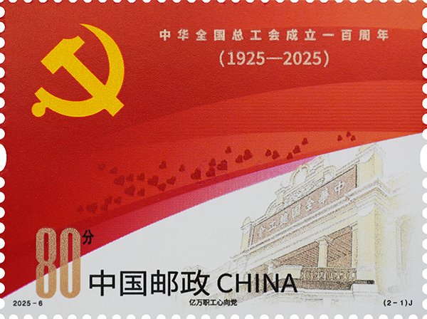 中国邮政定于2025年5月1日发行《中华全国总工会成立一百周年》纪念邮票1套2枚,邮票图案名称为:亿万职工心向党、团结奋斗新征程。全套邮票面值2.00元,计划发行数量570万套。