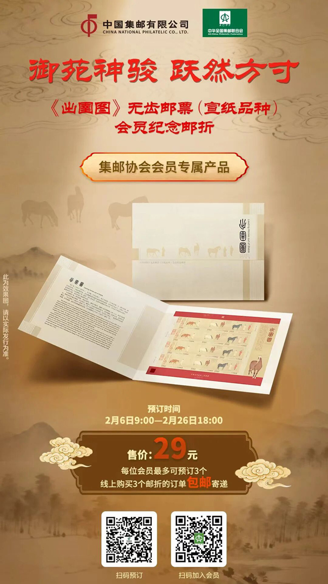 会员纪念邮折内含《出圉图》无齿邮票(宣纸品种)大版,售价29元,每位会员最多可预订3册。为保护会员权益,如预订量过大,后续个人限量将调整为1册或提前截止预订。预订截止后,将根据邮折的实际预订数量确定《出圉图》无齿邮票(宣纸品种)的发行数量。