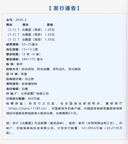 中国邮政定于2026年3月3日发行《出圉图》特种邮票1套3枚。邮票图案名称均为:出圉图(局部)。全套邮票面值3.90元。计划发行数量为460万套。