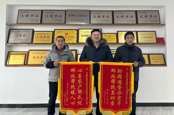 近日,石台县的农户代表们把绣有“心系农户解民忧 邮政帮扶暖人心”“助销鸡蛋办实事 邮政帮扶显担当”的两面锦旗送到了石台县邮政公司,为邮政服务真情点赞!