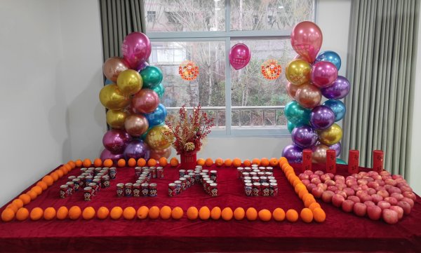 仪式现场布置精心、氛围热烈,气球装点、年味浓郁。创意摆台寓意美好:旺仔牛奶罐堆叠成 “开工大吉” 字样,苹果、桔子摆放成爱心造型,传递平安吉祥、团结奋进的美好祝愿。
