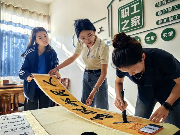 老职工老徐铺开毛毡,倒上墨汁,准备教年轻员工小吕和小喻写毛笔字。这是职工之家“书法角”的日常——只要不忙,老徐都会在这里待上一会儿,写写字,也教教年轻人。