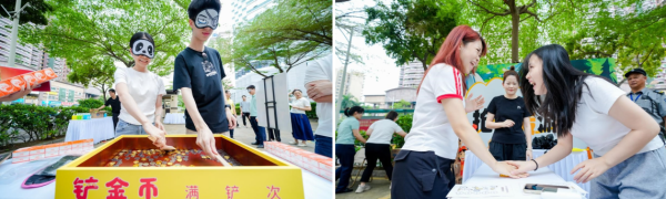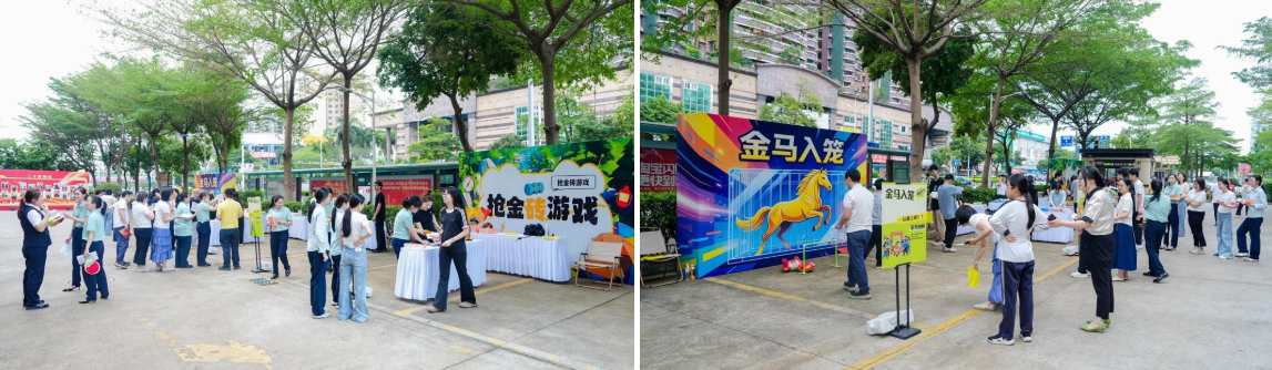 游戏区趣味盎然,走猫步、铲金币轻松解压,抢金砖、眼疾手快、金马入笼对战热烈。工会为获胜者准备擦手巾、防晒冰袖、洗手液、眼罩等实用好礼,趣味互动高潮迭起,全员踊跃参与、乐在其中。