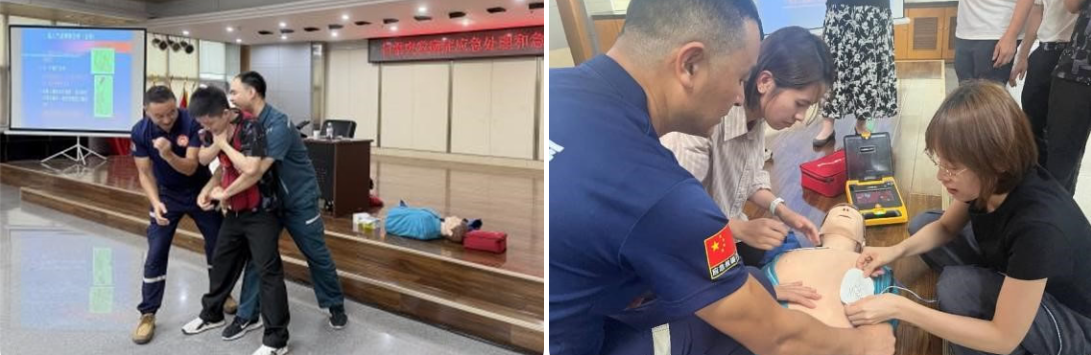 培训紧扣工作生活常见突发状况,围绕心肺复苏(CPR)、自动体外除颤器(AED)操作、海姆立克急救法、烧烫伤处置、中暑应急、触电救援及心脑血管意外识别等重点内容展开。教官结合20余年救援经验,以案例剖析、情景模拟等形式,深入浅出讲解各类突发事件处置原则与操作规范,强化全员对黄金救援时间的认知与把控。同时结合中医养生理念,普及日常健康保健知识,引导职工重视健康防护,做到防患于未然。