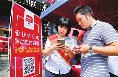 图为该分行员工近日在有关商圈推介移动支付。□广西记者 叶见锦 摄影报道