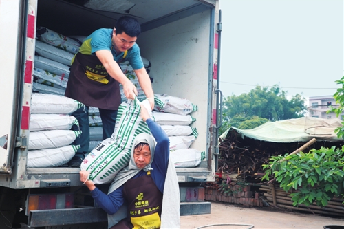 广西壮族自治区贵港市邮政分公司抓住有利时机,帮助农民春耕备耕。图为瓦塘邮政支局投递员为农民配送复合肥。□覃东新 摄影报道 |