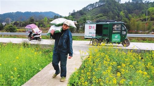 在湖南省会同县金子岩侗族苗族乡枞树脚村,邮政投递员为农户送去预订的化肥。□杨芳东 摄影报道 |