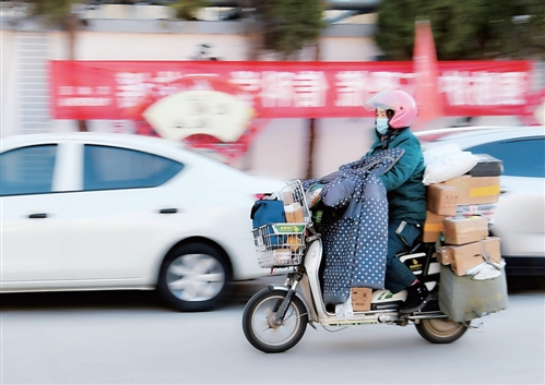 7.虚实的对比。虚实对比是突出主体的最基本方法。虚实是指画面影像清晰与模糊的程度。就是通过选择聚焦点,将需要着重表现的主体对象拍摄成清晰的“实像”,其他部分则虚化,自然突出了主体。在拍摄时准确聚焦,焦点区域内自然清晰,焦点以外的部位逐渐“虚糊”。也可通过景深控制的方法来突出主体——通过合理调整光圈、焦距和拍摄距离,可以获得较浅的景深,使前后景产生虚实对比的效果。当拍摄运动的对象时,可采用“追随”拍摄的方法,使得运动主体为“实”,其他运动对象“虚化”,表现运动主体的强烈动感。如下图(《疫情中的投递路上》,崔鹏森/摄)通过虚实对比,突出了主体形象和奔驰动作。要注意的是,“虚”的部分具有衬托作用,必须妥善处理,切忌杂乱无章。